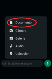 Al tocar el clip, se desplegará un menú con varias opciones: Galería, Audio, Ubicación, Contacto y Documento. Selecciona la opción “Documento”.